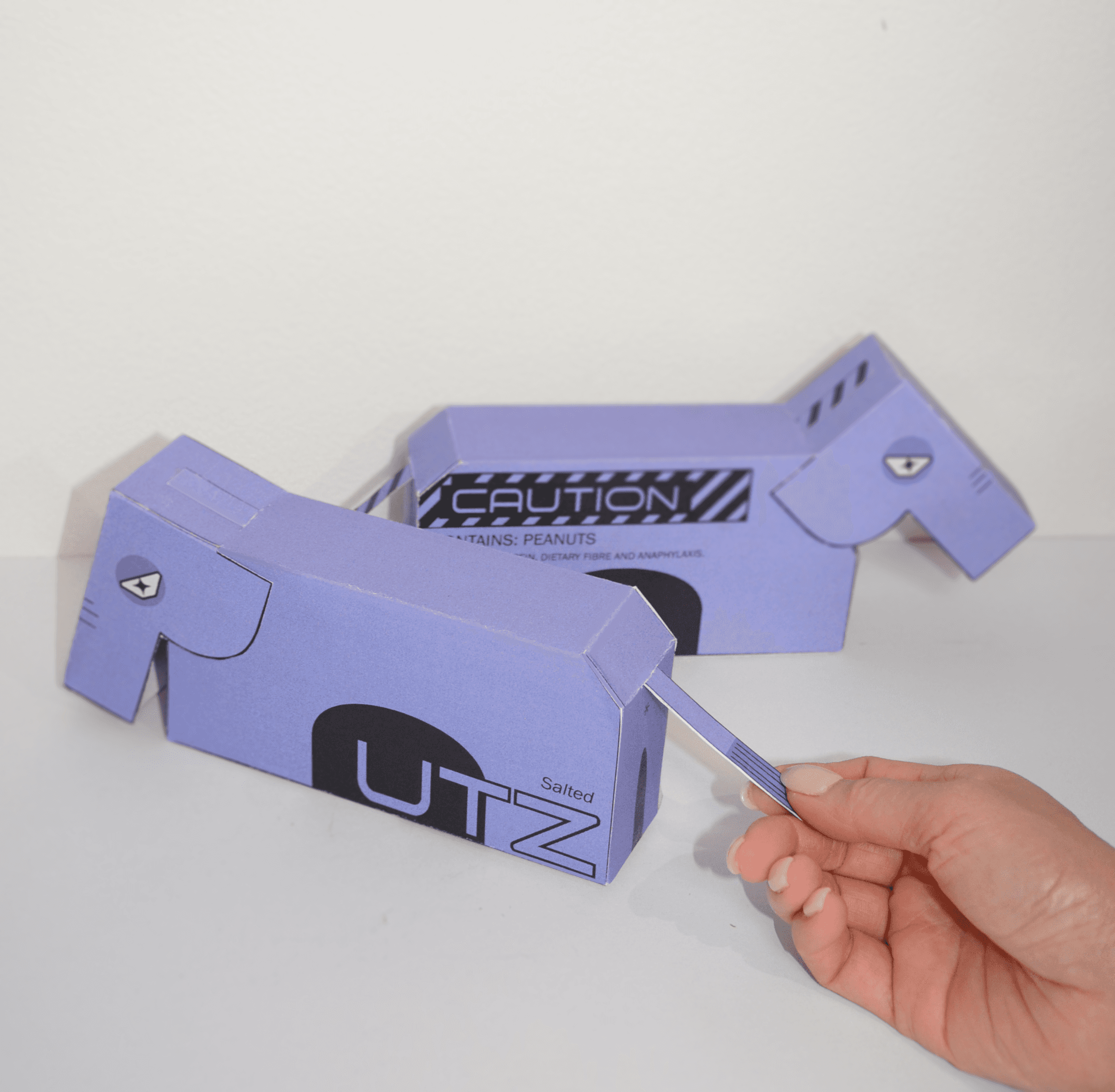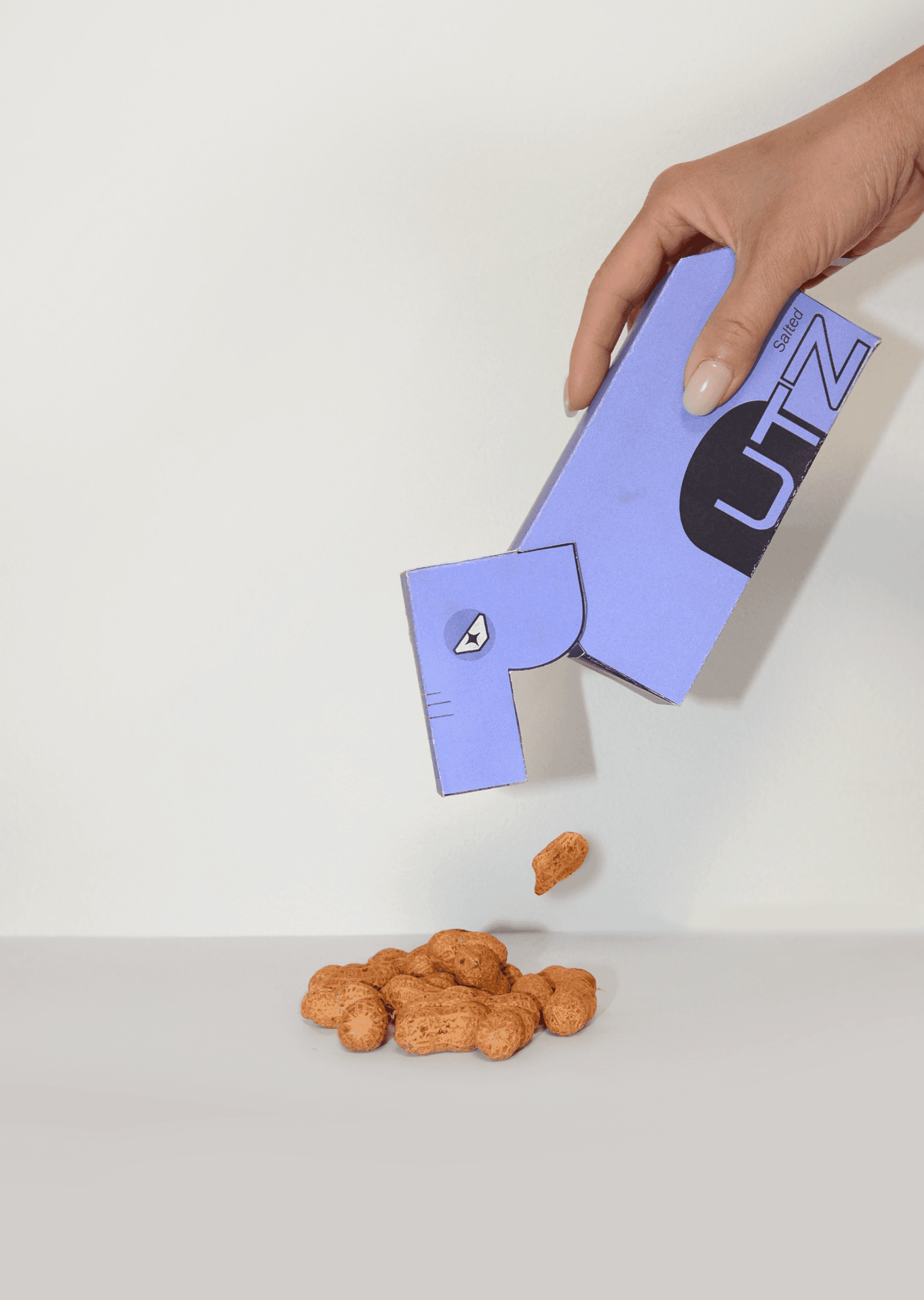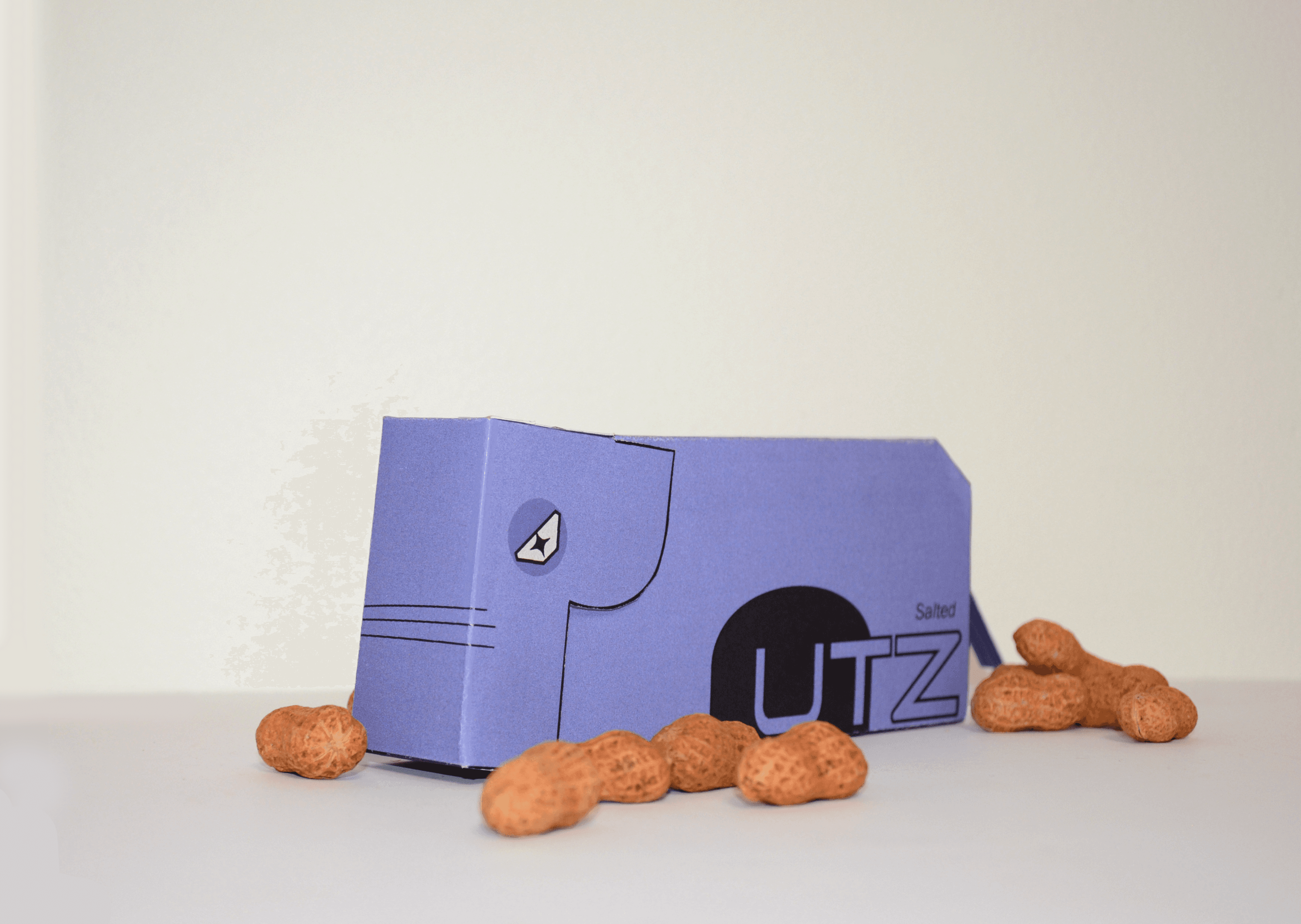 In the imagined high-tech year of 2050, PNUTZ, as packaging for flavoured peanuts in-shell, becomes a brand for risk-takers and the hardcore. Peanuts are symbolically represented through their narrative association to elephants in the image treatment of “PNUTZ” on the front. The character “P” becomes an illustrated side profile of an elephant’s head, ears and trunk, whilst the “N” is manipulated to look like a simplified representation of an elephant’s body from the side. The “P” also hinges back to reveal the package’s opening, mimicking the motion of how elephants tilt their head back and trumpet, further reinforcing storytelling through design. Any previous convention of packaging for nuts is disregarded through the unique shape of the package, as it fortifies a new cultural association between peanuts and the alienation of oneself with food.